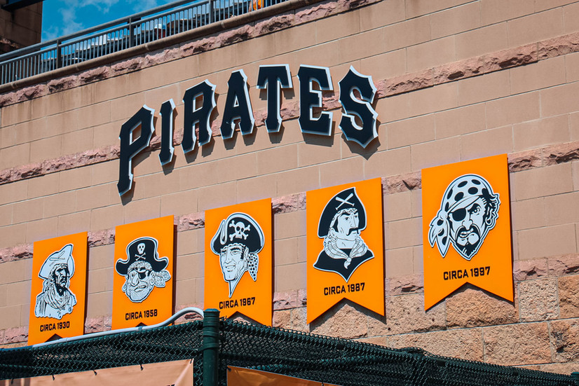 匹茲堡海盜隊的隊名由來有一段有趣的故事。球隊最初在 1882 年成立時名為阿勒格尼人隊,是取自當時所在地阿勒格尼市的名字。1891 年球隊從費城人隊手中搶下二壘手 Lou Bierbauer,由於過程充滿爭議,媒體批評匹茲堡這種行為「像海盜一樣掠奪」(piratical),引起不少不滿。沒想到當地球迷反而覺得這個海盜稱號很有氣勢,最後球隊乾脆將名稱正式改為 Pirates(海盜)並沿用至今。照片中的隊徽是海盜隊在 1997 年啟用,其中繪有兇猛神情的海盜形象凸顯了「海盜」的霸氣,我個人更喜歡這版勝過於現今的黃金色「P」字母隊徽。