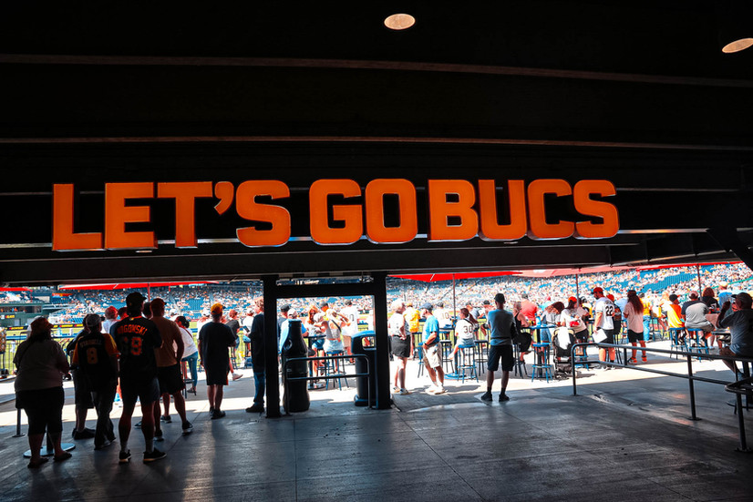 除了親子球迷外,也少不了那些全副武裝的狂熱支持者。有人頭綁海盜帽、揮著骷髏旗幟,整個造型像是從海上戰船直接走進球場隨著樂聲高唱著「Let's go Bucs!」。